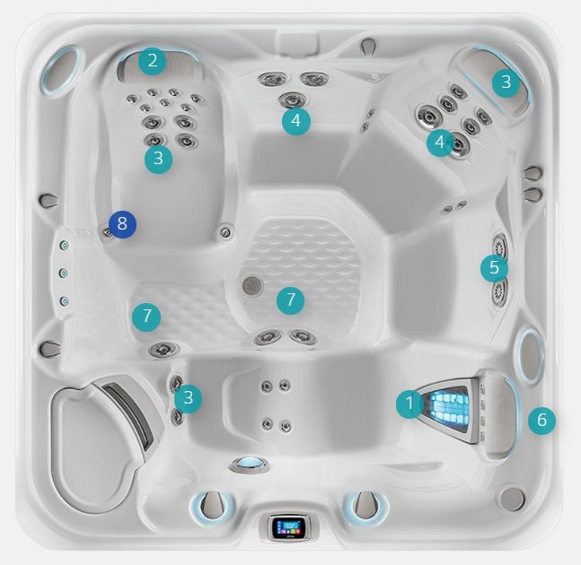 Cel mai bun loc din casă? Este fiecare scaun din Vanguard. Deschis și aerisit, acest spa de familie are șase locuri cu mult spațiu pentru picioare. Veți experimenta un masaj corporal complet pe două locuri cu jeturile noastre brevetate Moto-Massage® DX, precum și alte grupuri de jeturi direcționate pentru a vă calma gâtul, umerii, spatele și picioarele.