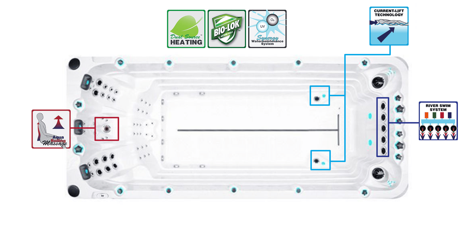 Bazinul SPA Activity 2 are 39 de jeturi de hidromasaj care creează vibrații ale apei, contracurent și valuri. Prin urmare, este ușor și simplu pentru o persoană să înoate într-un singur loc datorită perturbării puternice a apei. Intensitatea contracurentului este reglată prin control automat. Dispozitivul de alimentare cu apă sau de circulație a fluidelor include o pompă de curățare care previne dezvoltarea unui mediu patogen sau a blocajelor.