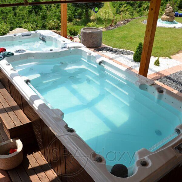 Cel mai important punct este reglarea direcției fluxului de apă de la duzele plutitoare. De asemenea, puteți regla puterea puterii hidraulice. Pentru un înotător, un adult foarte puternic, fluxul puternic de apă din jetul mare de înot creat de pompele de 3 CP îi va oferi înot fără sfârșit. Există 2 bare de iluminat pe ambele părți ale piscinei pentru exersarea corpului feminin în apă. Zona jacuzzi are un design frumos pentru 4 persoane, cu două scaune unul lângă altul, un șezlong.